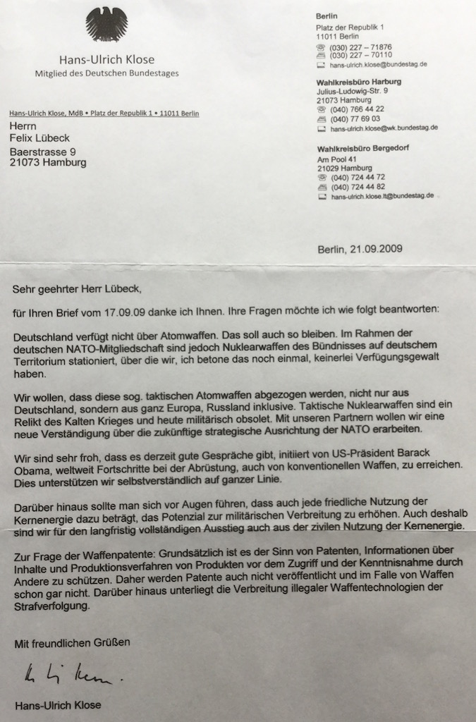 Patente ⌈werden⌋ nicht veröffentlicht und im Falle von Waffen schon gar nicht. (Hans-Ulrich Klose, seinerzeit Mitglied des Deutschen Bundestages, am 21.09.2008 als Antwort auf meinen Brief vom 17.9.2008)